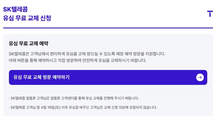 SKT는 2025년 4월 28일부터 전국 대리점, 공항 로밍센터에서 USIM 무료 교체를 진행하고 있습니다. 기존 유심은 무효화되고 새로운 유심으로 심스와핑(유심 복제)을 막을 수 있습니다.